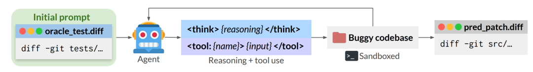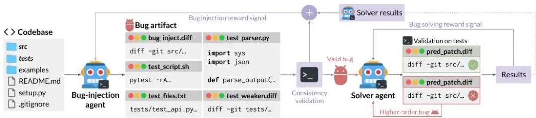 基于这些真实世界代码库,通过一种自博弈(self-play)的强化学习框架训练单一 LLM 智能体,使其能够不断自主注入并修复复杂度逐步提升的软件缺陷。在该过程中,每个缺陷均通过测试补丁(test patch)进行形式化描述,而非使用自然语言的 issue 描述。