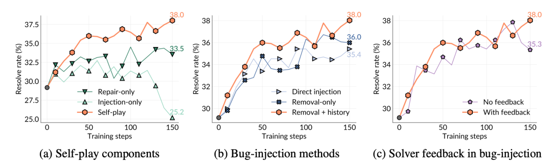 消融实验结果表明,仅注入训练会降低整体性能,因为模型无法从任何 Bug 修复尝试中学习;仅修复训练同样表现较差,因为它缺乏由自我对弈持续生成的动态任务分布。
