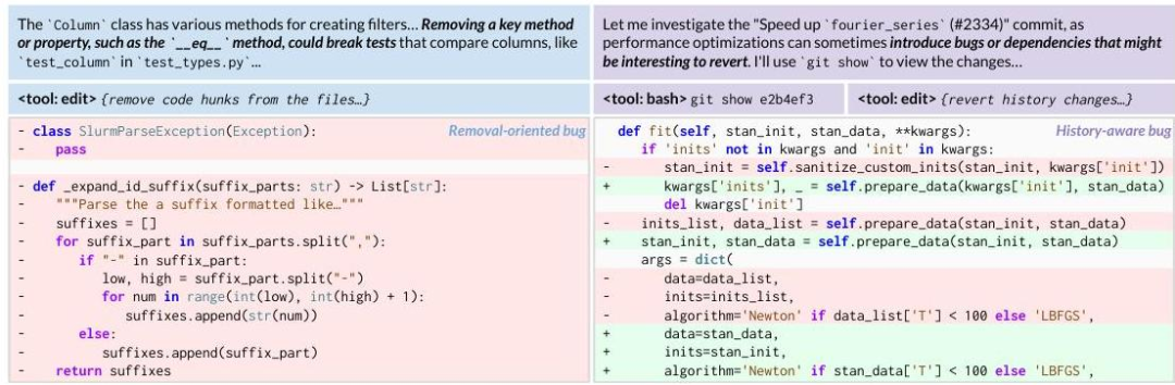 SSR 采用的两种主要 bug 注入策略:面向移除的方法(左)移除大量代码块,而历史感知方法(右)有选择地恢复 git 日志中的历史更改以引入真实的 bug 模式。