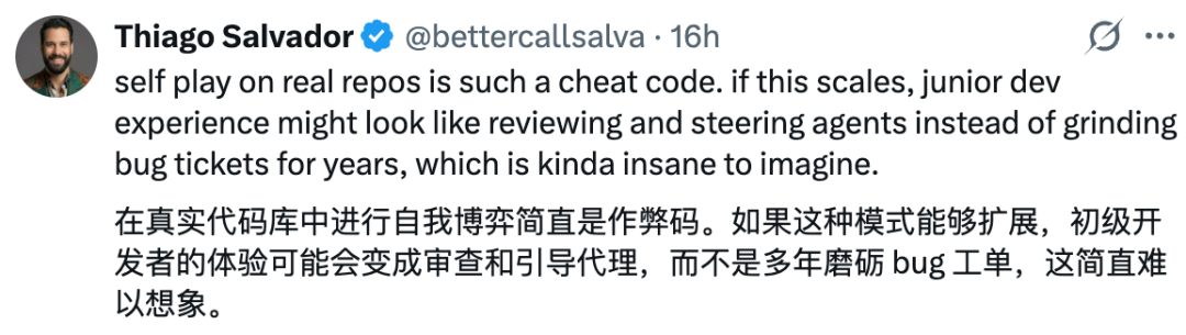 相比之下,自我对弈要求智能体不仅要修复 Bug,还要不断提出具有挑战性的 Bug,而这个过程本身就蕴含着丰富的学习内容: