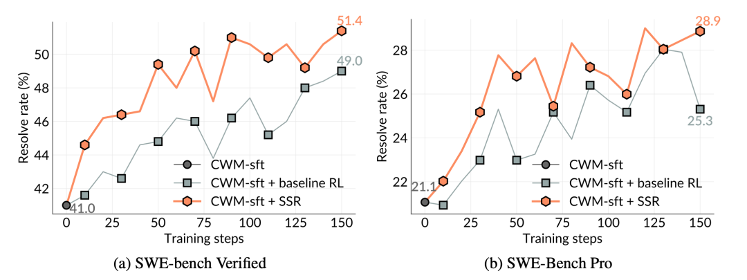 研究团队在 SWE-bench Verified 与 SWE-Bench Pro 两个基准测试上,对基础模型(Base Model)、传统强化学习方法(Baseline RL),以及 SSR 方法进行了系统对比。