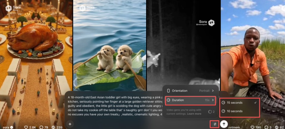 仔细一看,确实有些细节不太自然,而且视频大多在 15 秒以内,符合大多数 AI 生成视频时长限制(Sora2 可以单次生成最长 15 秒的视频)。
