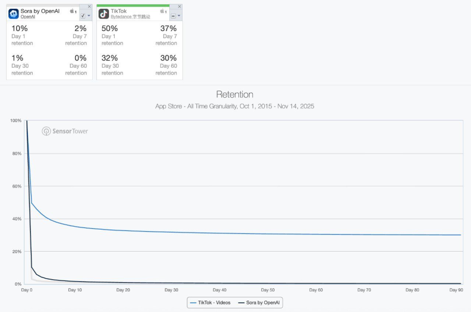 近日,a16z 合伙人 Olivia Moore 给 OpenAI 泼了盆冷水。她拿出 Sensor Tower 的数据,把 Sora App 和 TikTok 的留存率放在一起对比,发现 Sora 的下载量还在持续增长,但用户留存率相当疲软:第 1 天只剩 10%,第 7 天 2%,第 30 天 1%,第 60 天直接归零,而 TikTok 同期还能稳在 30% 左右。