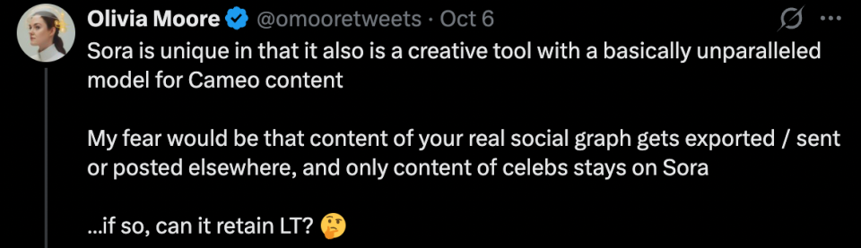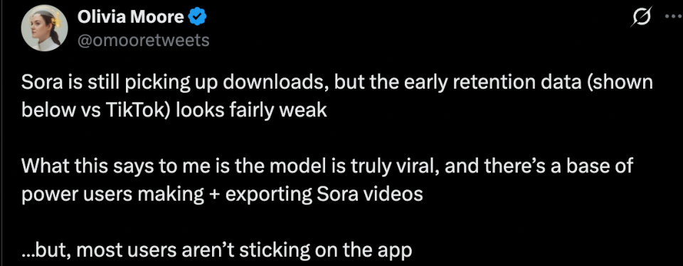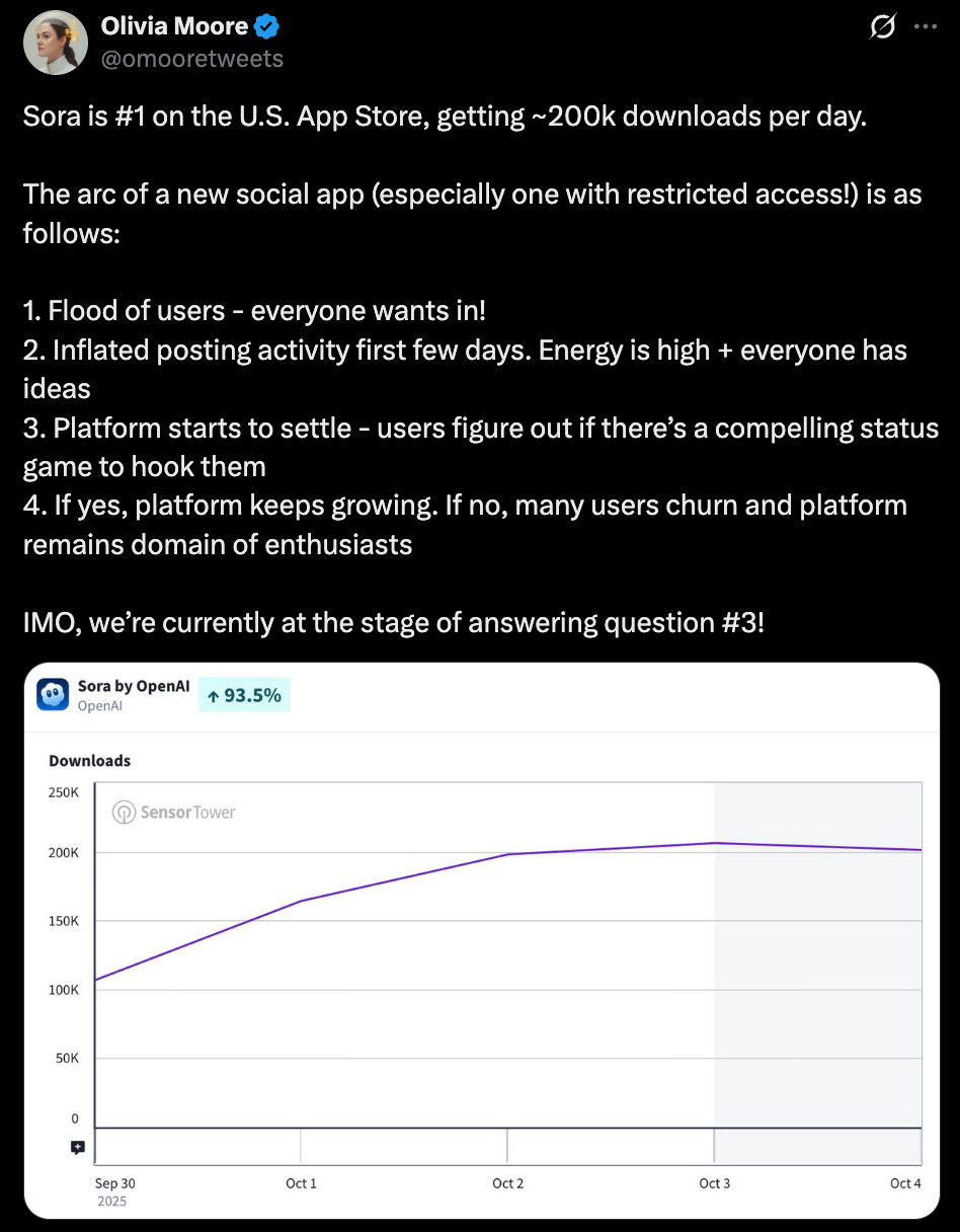 Olivia Moore 的判断是:Sora 会继续作为一个强大的创意工具蓬勃发展,但作为社交产品可能就没那么成功了。工具类产品的特点是用户带着明确目的来,完成任务就走,留存率天然不高。从目前的数据来看,Sora 更像是视频创作者的 Photoshop,而不是下一个 TikTok。
