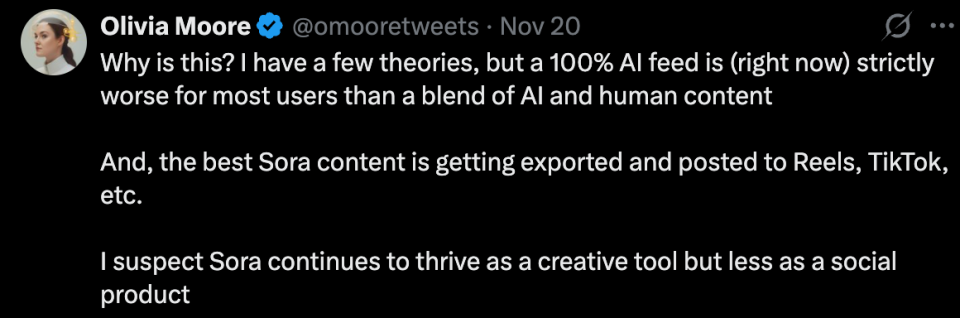 一个百分之百 AI 生成内容的 Feed 流,体验远不如真人内容和 AI 内容混合的平台,毕竟人们刷社交媒体,是想看真实的人、真实的故事,而不是一堆精美但缺乏温度的 AI 作品,更何况最好的 Sora 内容正在被导出其他平台。