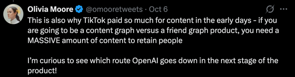换句话说,Sora 更像是一个内容生产工厂,但用户并不想留在工厂里消费内容,他们更喜欢把产品拿到别的地方去展示。这也是为什么 TikTok 早期花了大价钱购买内容,如果你要做「内容社交图谱」而不是「朋友社交图谱」产品,你就需要海量的内容来留住用户。