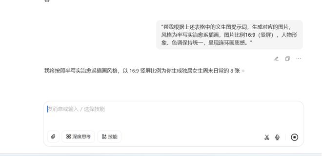 第二步:AI生成统一风格图片 脚本中的“文生图提示词”已经帮大家锁定了风格和细节,接下来直接让豆包生成图片。 发送提示词:“帮我根据上述表格中的文生图提示词,生成对应的图片,风格为半写实治愈系插画,图片比例16:9(竖屏),人物形象、色调保持统一,呈现连环画质感。” 如图所示: