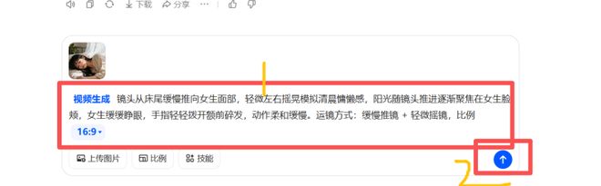 把表格中对应的“运镜方式”和“图生视频提示词”一起发给豆包, 示例指令:“帮我生成视频:镜头从床尾缓慢推向女生面部,轻微左右摇晃模拟清晨慵懒感,阳光随镜头推进逐渐聚焦在女生脸颊,女生缓缓睁眼,手指轻轻拨开额前碎发,动作柔和缓慢” 如图所示