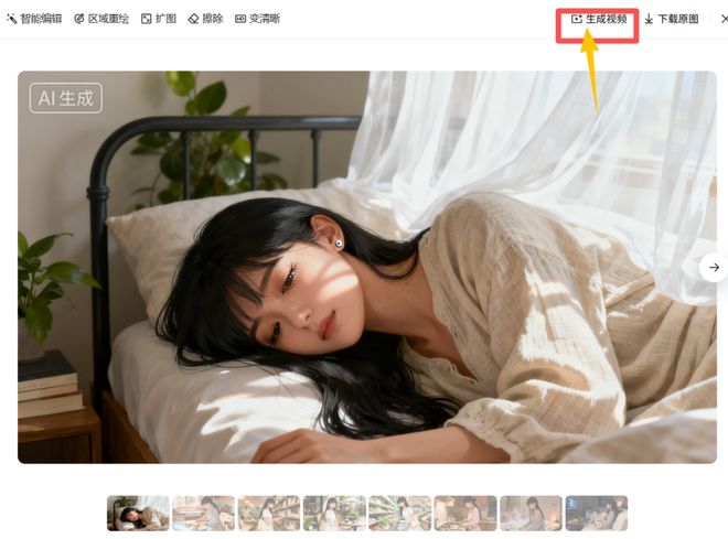第三步:图生视频,还原场景动感 有了图片,下一步就是让静态画面动起来!操作超简单,跟着步骤来: 打开豆包,点击要生成视频的图片,放大到右侧显示区; 点击右上角“生成视频”功能; 如图所示: